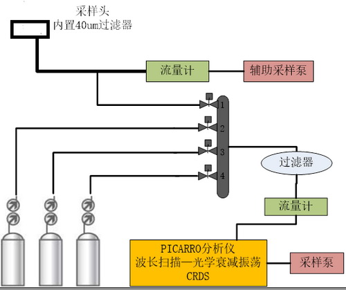 在辅助采样泵的作用下,样气经过加热型的气体采样总管,输送至控制室,为了避免在长距离传输的过程中目标气体及水分子的滞留和损失,一般采用20L/min的辅助采样泵进行采样,分析仪通过自带的采样泵从辅助气路采集10L/min的气体进入分析仪进行分析,分析仪与支管接头间安装2um过滤器。分析仪采用10Hz的频率测定CO2、CH4和H2O的浓度,分析仪可在单CO2和H2O测量模式、单CH4和H2O测量模式和同时测量模式运行。